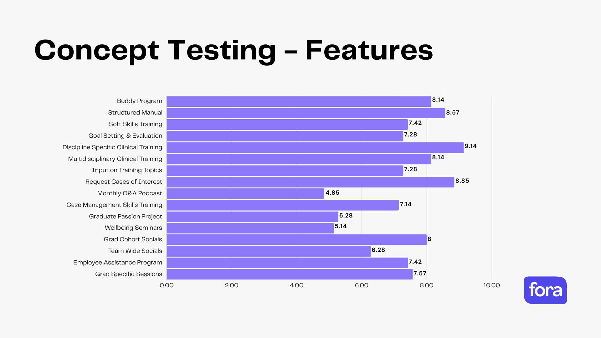 To make sure that each feature included in the graduate program addresses the needs and wants of new graduates, we concept tested these with 7 new graduates and asked them to rank how important each feature on a scale of 1-10. (1 being “not essential” and 10 being “absolutely essential’).