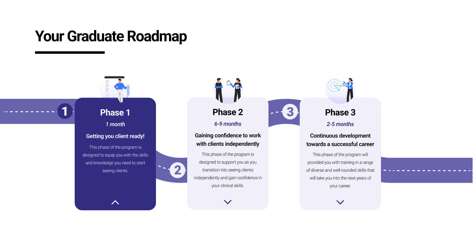 Features with high ranks in the concept testing were incorporated into different phases of the program to help new graduates build confidence in independent client work and develop a variety of skills through professional development training and workshops.