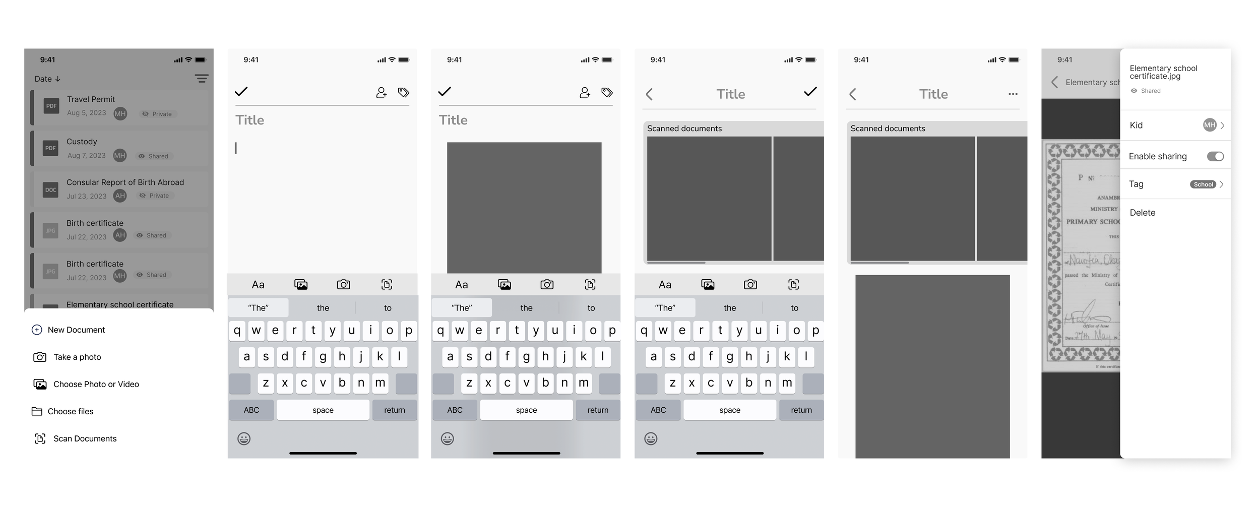Co-parents can upload relavant photos, files from the phone directly or scan multi-page documents on hand. They can also add prebuilt tags to each document.