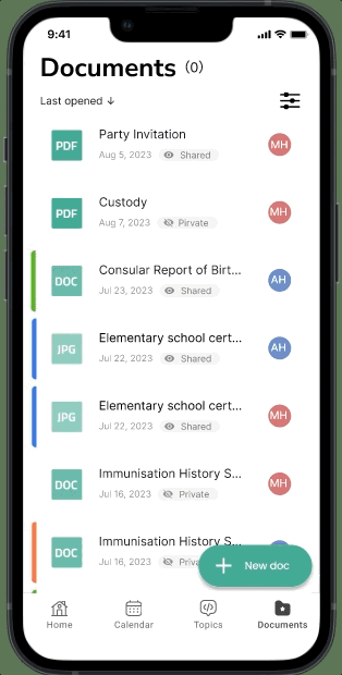 Documents are arranged by the last opened date by default. Co-parents can locate specific documents by filtering kids or/and tags.