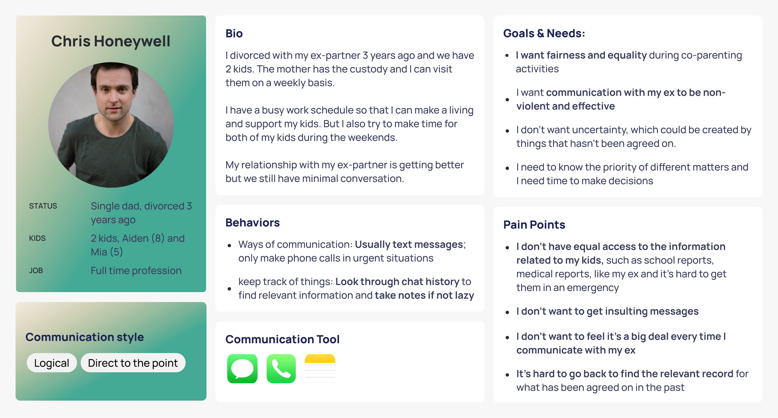 I also created two primary personas to represent the goals and needs, typical behaviors and major pain points of co-parents.